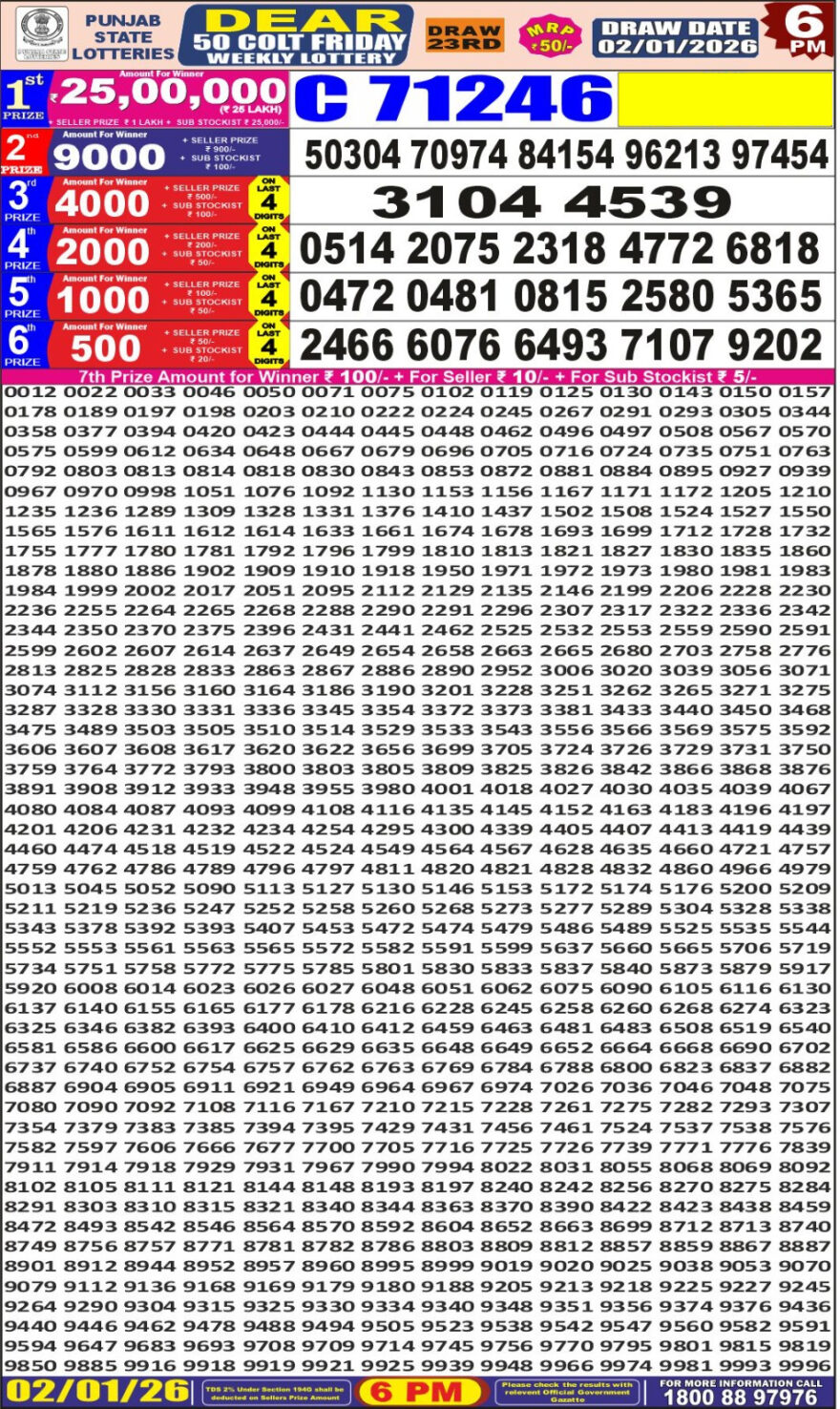 Dear Lottery Chart – Punjab State Dear 50 (6 PM) 02/01/2026 | Result Chart January 2, 2026 Leave a Comment on Dear Lottery Chart – Punjab State Dear 50 (6 PM) 02/01/2026 | Result Chart Share: XFacebookPinterestRedditVKDiggLinkedinMix Related Articles 0 120 Dear Lottery Result Chart Dear 10 1:30PM 15/06/2025 0 95 Dear 10 Lottery Chart 1:30 PM Result – 06/08/2025 | Dear Lottery Chart Online 0 113 Dear 10 Lottery Chart 1:30 PM Result – 14/07/2025 | Dear Lottery Chart Online 0 144 Dear Lottery Result Chart Punjab State Dear 10 6 PM 18/5/2025