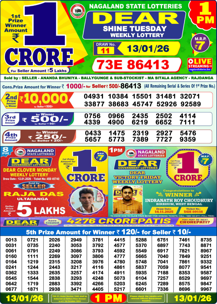 Dear Lottery Chart Today 1 PM 13/01/2026 | Dear Morning Result Chart January 13, 2026 Leave a Comment on Dear Lottery Chart Today 1 PM 13/01/2026 | Dear Morning Result Chart Share: XFacebookPinterestRedditVKDiggLinkedinMix Related Articles 0 64 Dear Lottery Chart 1 PM Result – 30/10/2025 | Today’s Dear Chart 0 110 Dear Lottery Chart 1 PM Result – 22/07/2025 | Today’s Dear Chart 0 37 Dear Lottery Chart 1 PM Result – 11/12/2025 | Today’s Dear Chart 0 49 Dear Lottery Chart 1 PM Result – 22/11/2025 | Today’s Dear Chart
