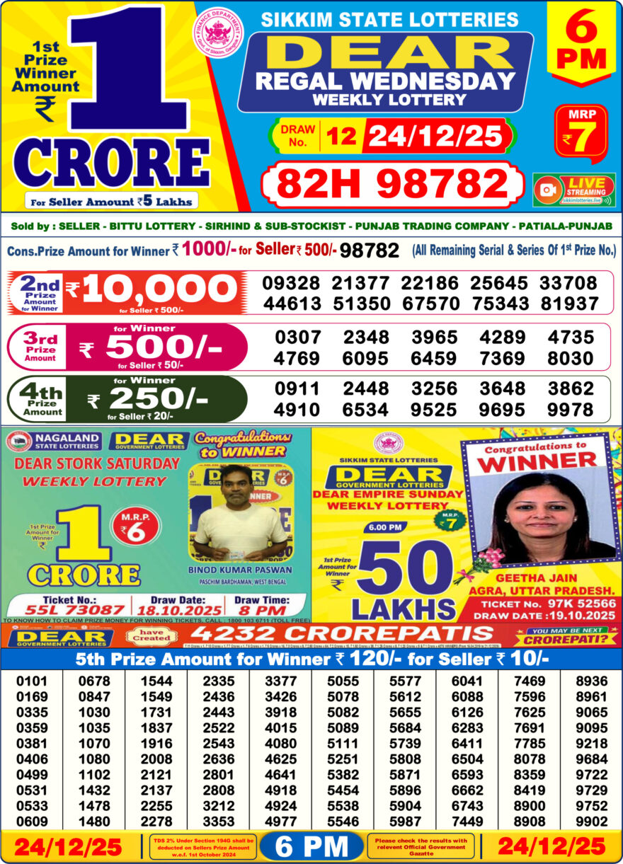 Dear Lottery Chart Today 6 PM 24/12/2025 | Dear Result Chart Evening December 24, 2025 Leave a Comment on Dear Lottery Chart Today 6 PM 24/12/2025 | Dear Result Chart Evening Share: XFacebookPinterestRedditVKDiggLinkedinMix Related Articles 0 39 Dear Lottery Chart Today 6 PM 22/12/2025 | Dear Result Chart Evening 0 84 Dear Lottery Chart 6 PM Result – 17/09/2025 | Latest Dear Lottery Chart 0 389 Dear Lottery Result Chart 6PM 0 16 Dear Lottery Chart Today 6 PM 10/01/2026 | Dear Result Chart Evening