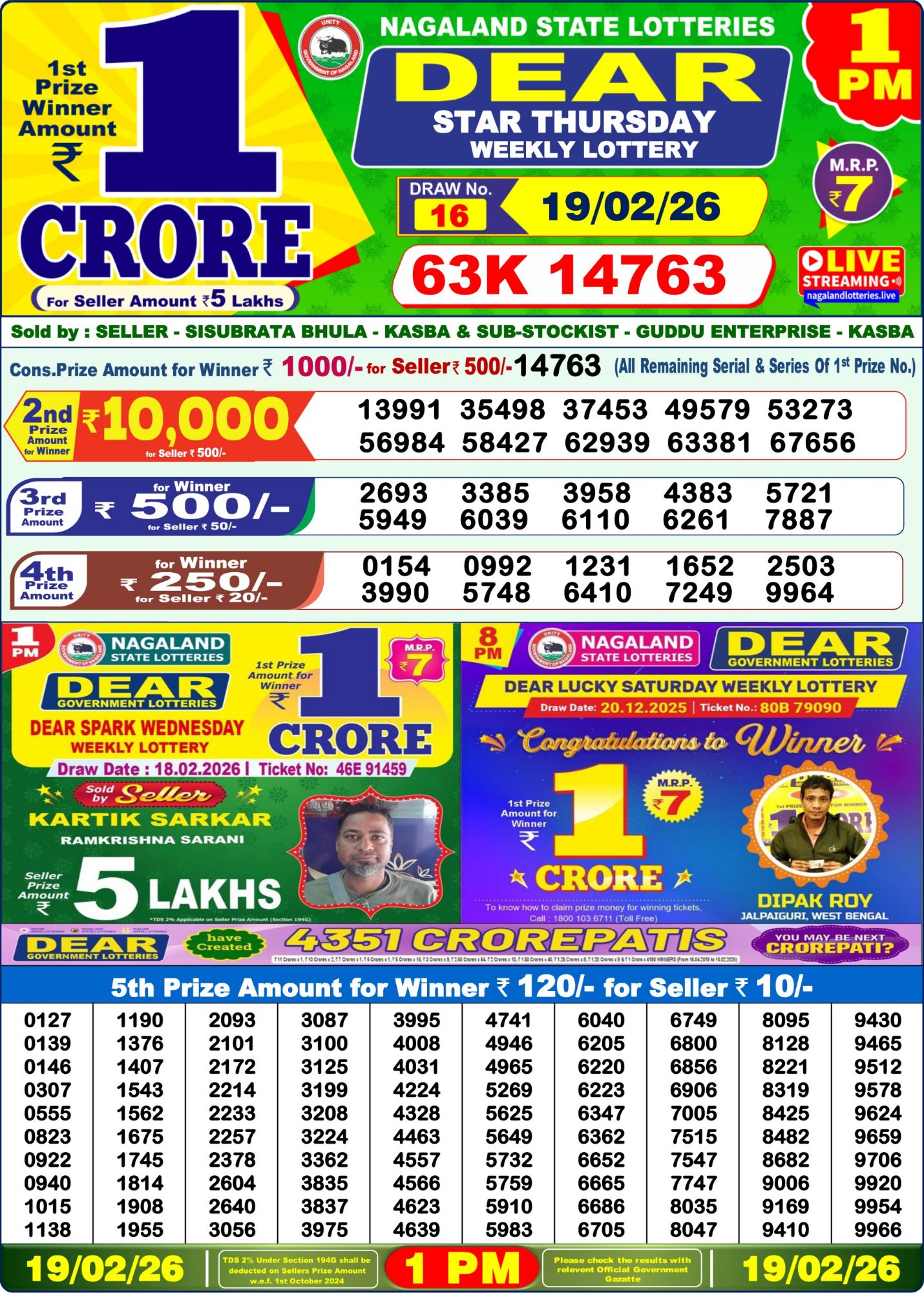 Yes, the Dear Result 1 PM for 19-02-2026 has been declared. You can view the winning chart above.