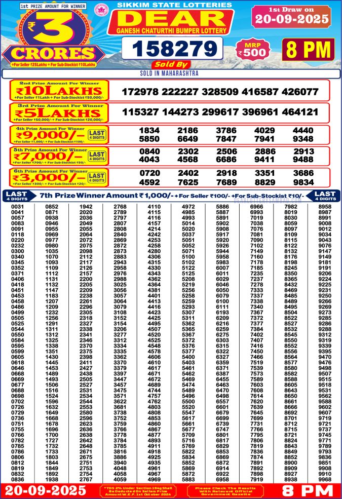 Sikkim State Ganesh Chaturthi Bumper Lottery Result 20/09/2025 Today