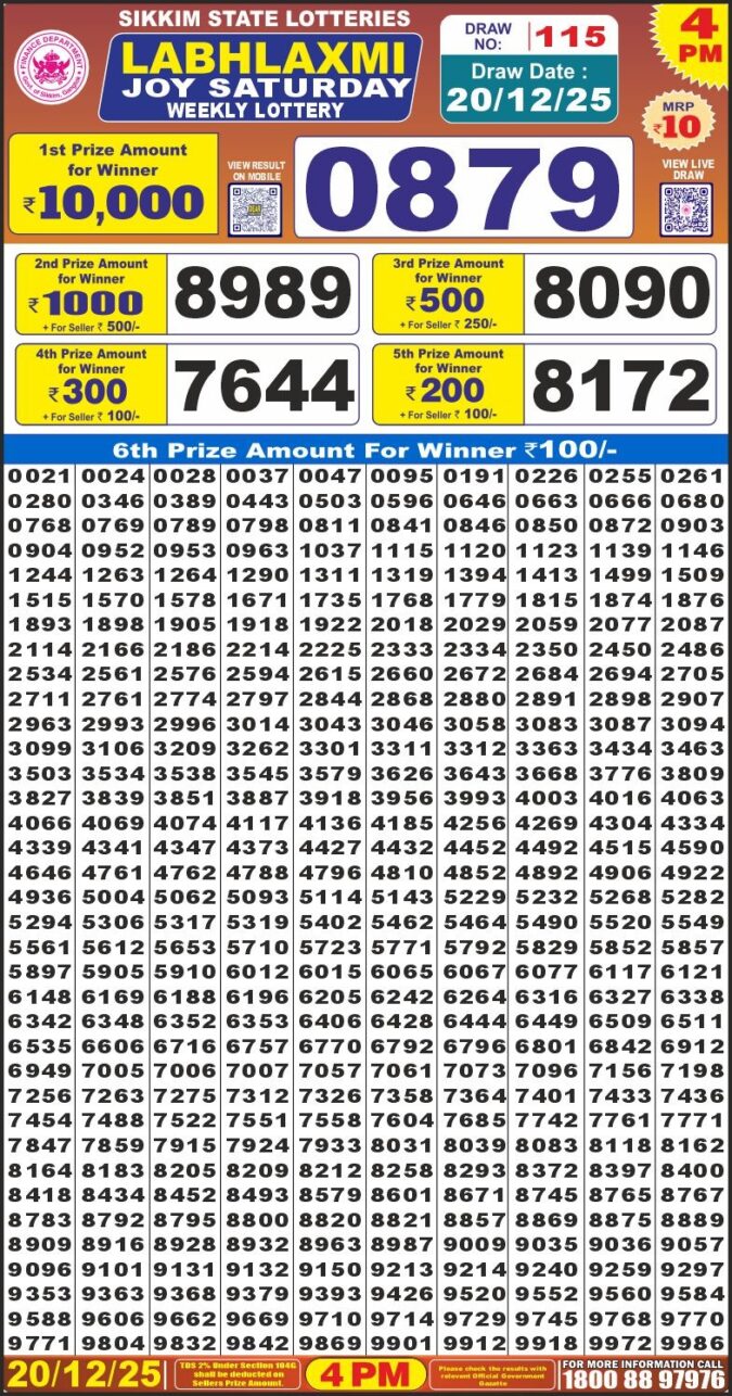 Dear Lottery Chart Labh Laxmi 4 PM 20/12/2025 | Dear Result Chart Today