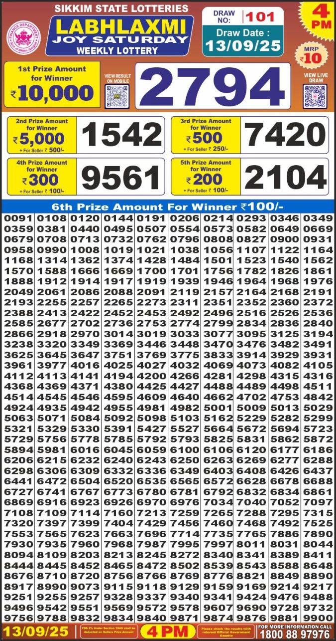 Labh Laxmi Dear Lottery Chart 4 PM Result – 13/09/2025 | Dear Lottery Chart Today