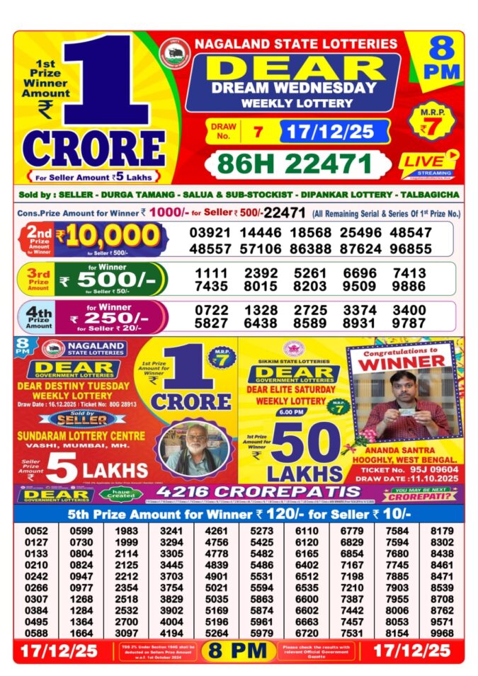 Dear Lottery Chart Today 6 PM 17/12/2025 | Dear Result Chart Evening