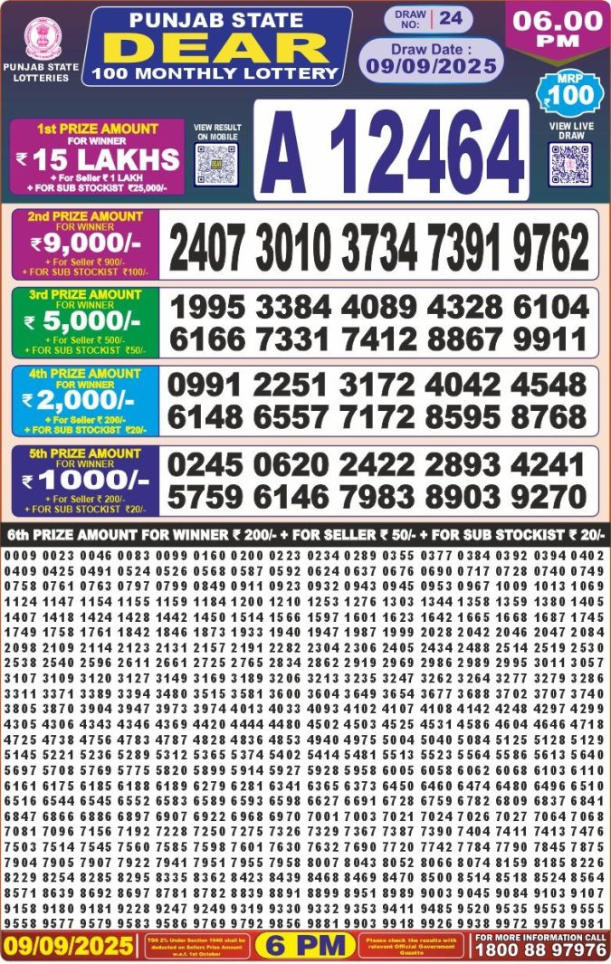 Punjab State Dear 50 Lottery Chart 6 PM Result – 09/09/2025 | Dear Lottery Result Chart Today