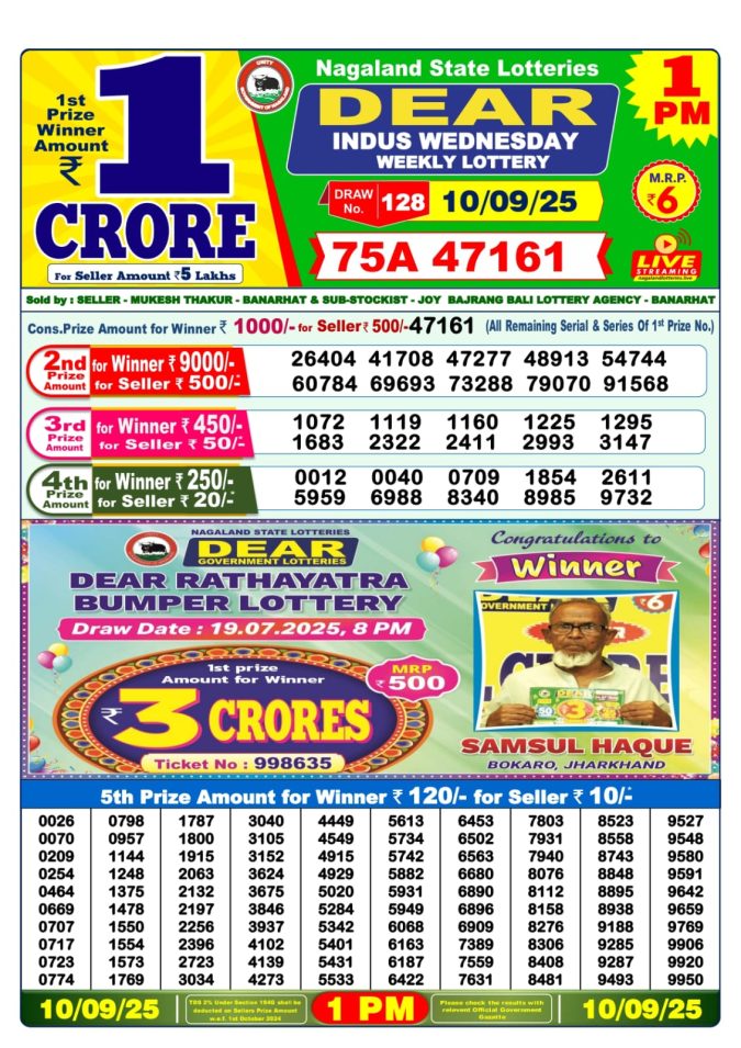 Dear Lottery Chart 1 PM Result – 10/09/2025 | Today’s Dear Chart