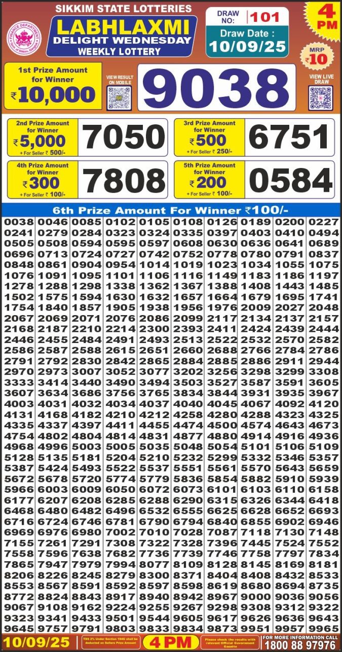 Labh Laxmi Dear Lottery Chart 4 PM Result – 10/09/2025 | Dear Lottery Chart Today