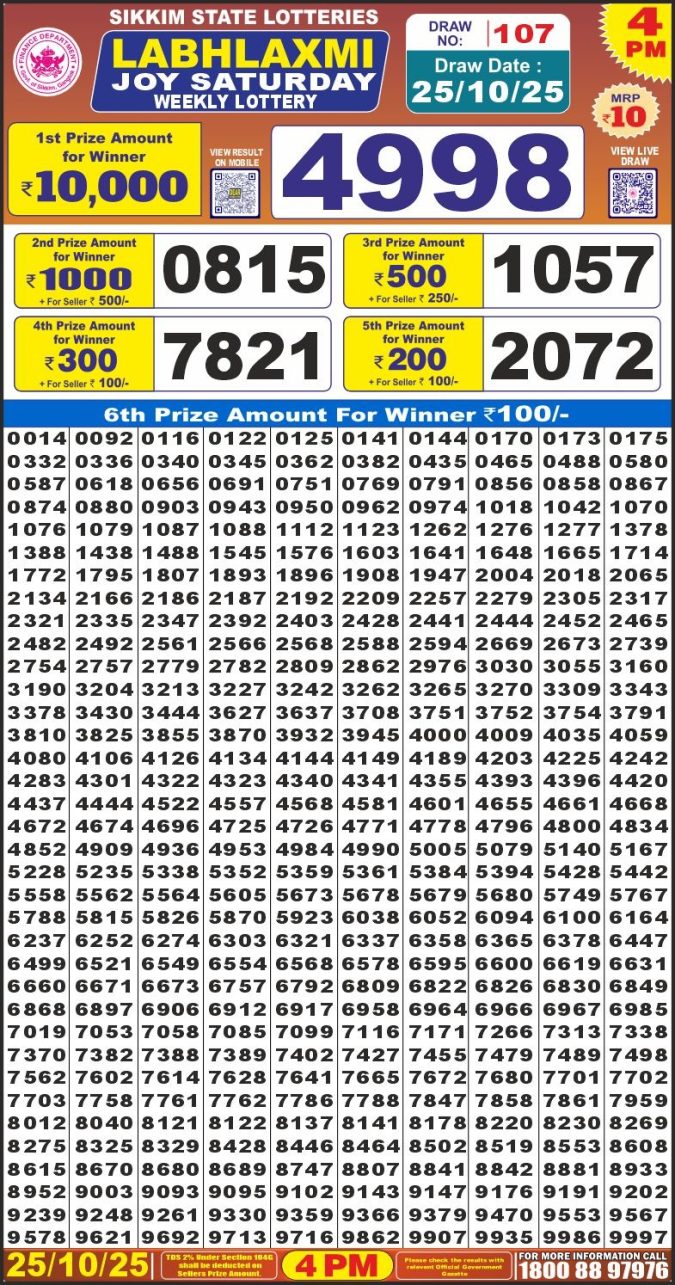 Labh Laxmi Dear Lottery Chart 4 PM Result – 25/10/2025 | Dear Lottery Chart Today