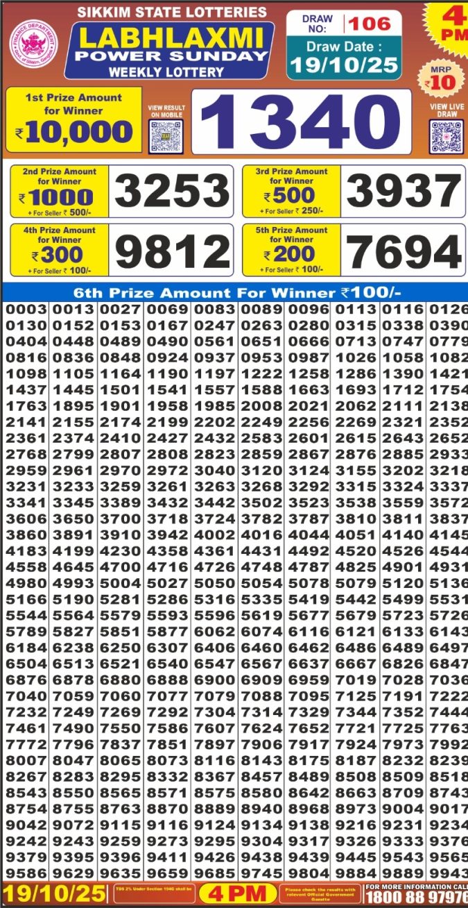 Labh Laxmi Dear Lottery Chart 4 PM Result – 19/10/2025 | Dear Lottery Chart Today