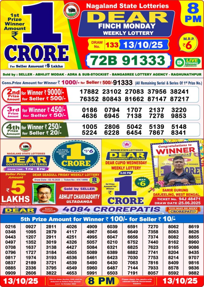 Dear Lottery Chart 8 PM Result – 13/10/2025 | Latest Dear Lottery Results Chart