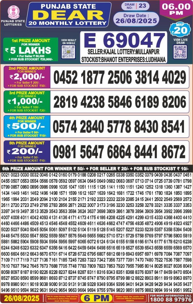 Punjab State Dear 20 Monthly Lottery Result 26.08.25 Prize List