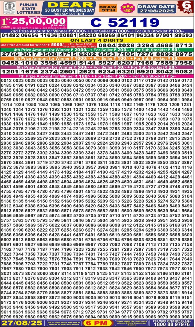 Punjab State Dear 50 Lottery Chart 6 PM Result – 27/08/2025 | Dear Lottery Result Chart Today