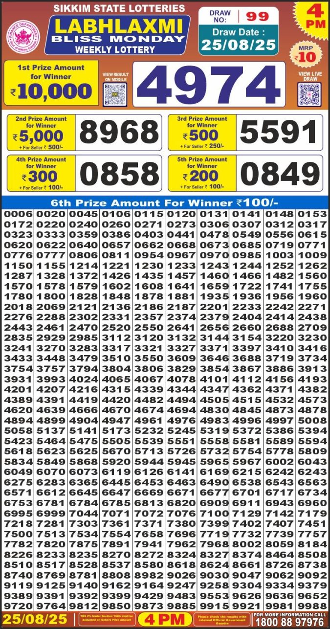 Labh Laxmi Dear Lottery Chart 4 PM Result – 25/08/2025 | Dear Lottery Chart Today