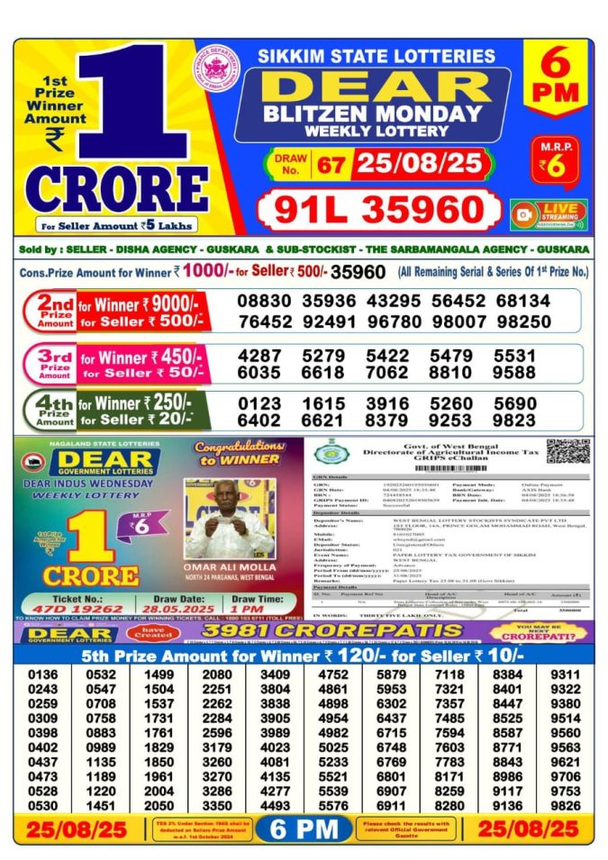 Dear Lottery Chart 6 PM Result – 25/08/2025 | Latest Dear Lottery Chart