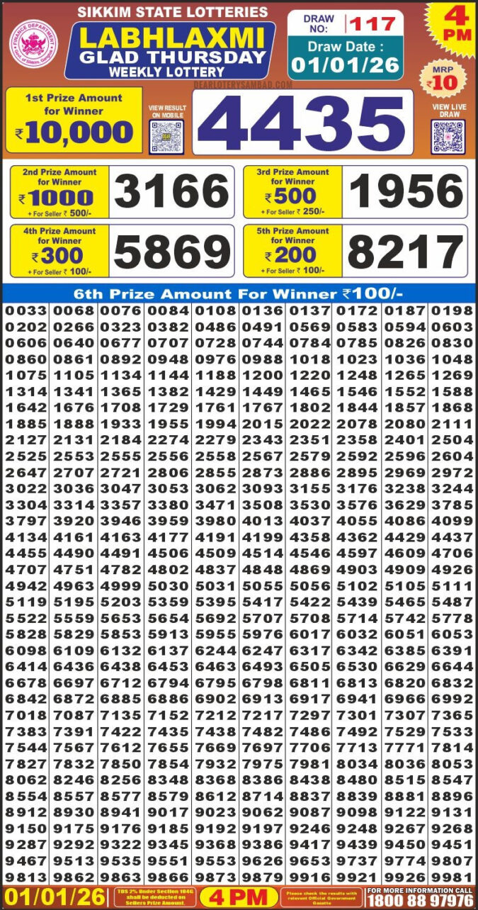 Dear Lottery Chart Labh Laxmi 4 PM 01/01/2026 | Dear Result Chart Today